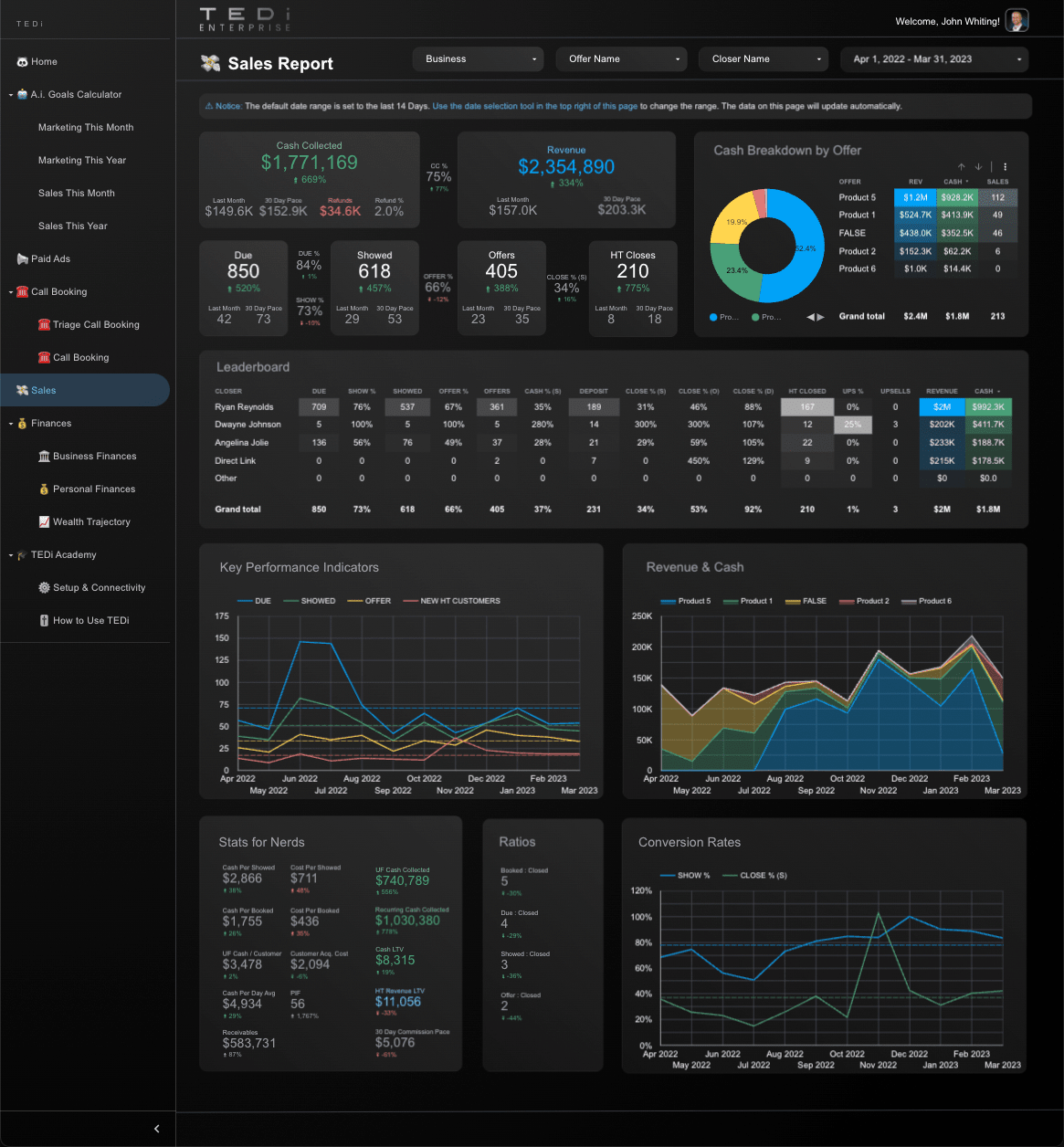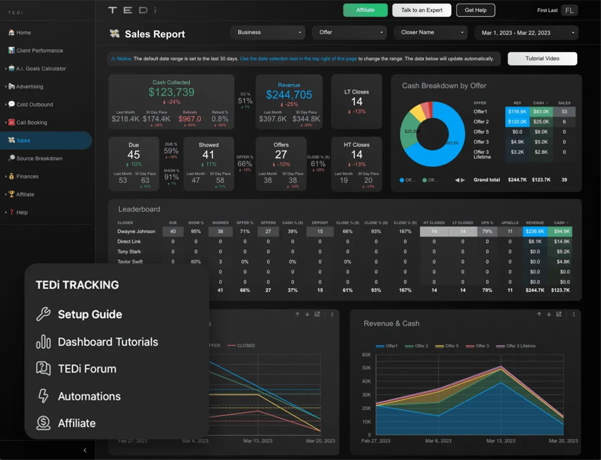 A dashboard for every area of your business including advertising, cold outbound, call booking, sales, source breakdown & finances